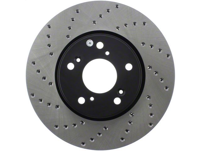StopTech Drilled Sport Rotors are 1-piece direct replacement brake discs for factory brake systems and stock calipers that look great behind your wheels and offer significantly improved braking performance. The unique cross-drilling aids with heat and brake dust dispersal, prevents glazing of the pads, adds bite and improves wet and dry braking performance. Built to last, the black e-coating provides protection from corrosion and the high carbon metallurgy (in most applications) offers quieter operation, better crack resistance and increased performance.