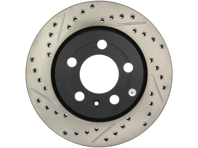 StopTech Drilled and Slotted Sport Rotors are 1-piece direct replacement brake discs for factory brake systems and stock calipers that look great behind your wheels and offer significantly improved braking performance. The unique cross-drilling and slotting aids with heat and brake dust dispersal; prevents glazing of the pads; adds bite and improves wet and dry braking performance. Built to last; the black e-coating provides protection from corrosion and the high carbon metallurgy (in most applications) offers quieter operation; better crack resistance and increased performance.