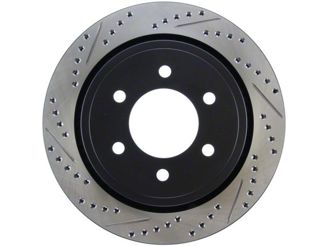 StopTech Drilled and Slotted Sport Rotors are 1-piece direct replacement brake discs for factory brake systems and stock calipers that look great behind your wheels and offer significantly improved braking performance. The unique cross-drilling and slotting aids with heat and brake dust dispersal; prevents glazing of the pads; adds bite and improves wet and dry braking performance. Built to last; the black e-coating provides protection from corrosion and the high carbon metallurgy (in most applications) offers quieter operation; better crack resistance and increased performance.