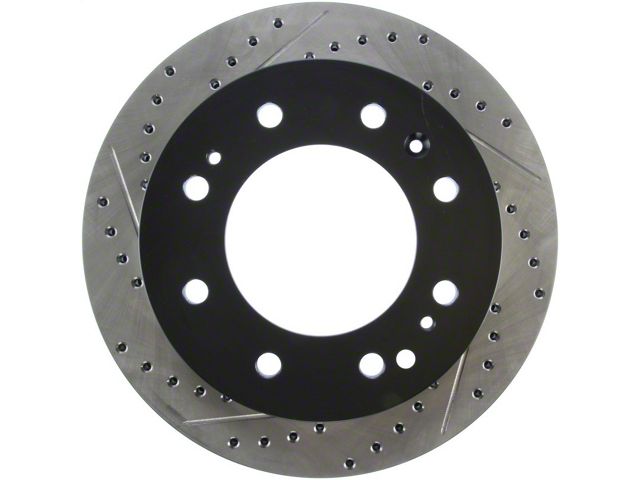 StopTech Drilled and Slotted Sport Rotors are 1-piece direct replacement brake discs for factory brake systems and stock calipers that look great behind your wheels and offer significantly improved braking performance. The unique cross-drilling and slotting aids with heat and brake dust dispersal, prevents glazing of the pads, adds bite and improves wet and dry braking performance. Built to last, the black e-coating provides protection from corrosion and the high carbon metallurgy (in most applications) offers quieter operation, better crack resistance and increased performance.