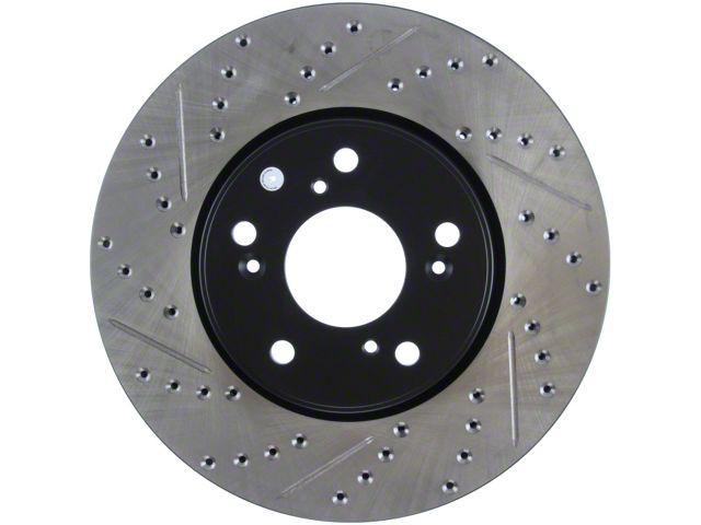 StopTech Drilled and Slotted Sport Rotors are 1-piece direct replacement brake discs for factory brake systems and stock calipers that look great behind your wheels and offer significantly improved braking performance. The unique cross-drilling and slotting aids with heat and brake dust dispersal, prevents glazing of the pads, adds bite and improves wet and dry braking performance. Built to last, the black e-coating provides protection from corrosion and the high carbon metallurgy (in most applications) offers quieter operation, better crack resistance and increased performance.