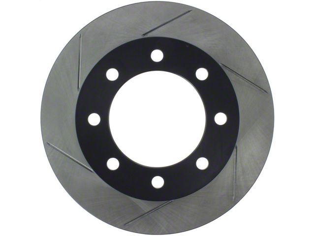 StopTech Slotted Sport Rotors are 1-piece direct replacement brake discs for factory brake systems and stock calipers that look great behind your wheels and offer significantly improved braking performance. The unique slotting aids with heat and brake dust dispersal; prevents glazing of the pads; adds bite and improves wet and dry braking performance. Built to last; the black e-coating provides protection from corrosion and the high carbon metallurgy (in most applications) offers quieter operation; better crack resistance and increased performance.