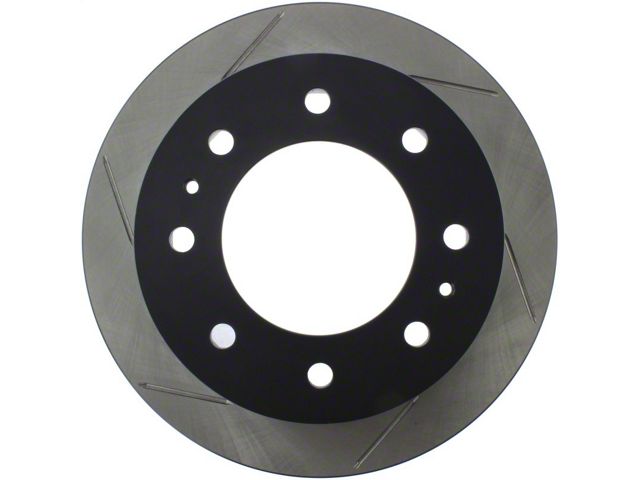StopTech Slotted Sport Rotors are 1-piece direct replacement brake discs for factory brake systems and stock calipers that look great behind your wheels and offer significantly improved braking performance. The unique slotting aids with heat and brake dust dispersal, prevents glazing of the pads, adds bite and improves wet and dry braking performance. Built to last, the black e-coating provides protection from corrosion and the high carbon metallurgy (in most applications) offers quieter operation, better crack resistance and increased performance.