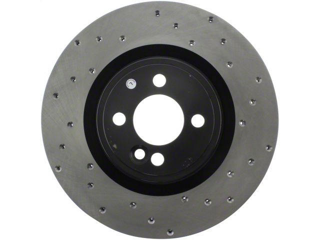 StopTech Drilled Sport Rotors are 1-piece direct replacement brake discs for factory brake systems and stock calipers that look great behind your wheels and offer significantly improved braking performance. The unique cross-drilling aids with heat and brake dust dispersal, prevents glazing of the pads, adds bite and improves wet and dry braking performance. Built to last, the black e-coating provides protection from corrosion and the high carbon metallurgy (in most applications) offers quieter operation, better crack resistance and increased performance.