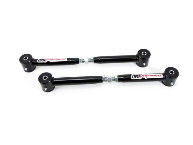Replace your weak, factory stamped rear lower control arms with UMI's heavy-duty tubular set up. These control arms are constructed of DOM mild steel tubing, CNC machined and fully TIG welded. Control arms are supplied with Energy Suspension polyurethane bushings for ride comfort and feature on-car adjustability. Quick and easy on-car adjustments can be made with a simple turn of the wrench. Adjusting the control arms is used to gain additional clearance when running large tires and used to center aftermarket rear ends in the wheel well.
