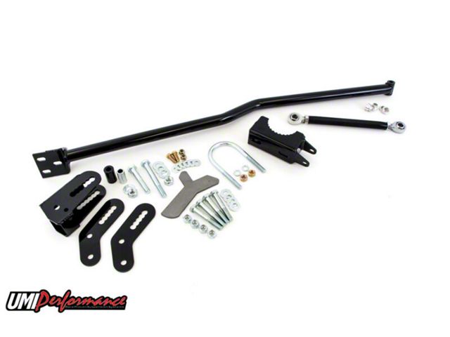 UMI's 3rd and 4th Generation GM F-Body competition panhard bar lowering and leveling kit is designed to increase over-the-axle exhaust pipe clearance and also lower and level the Panhard bar. This competition proven setup includes a weld-in reinforcement plate for the factory panhard bar mount as well as an adjustable strut to prevent lateral movement of the bracket system. Laser cut adjustment slots permit lowering and leveling the PHB for roll center height and performance tuning. This kit gives much of the performance of a Watts Link with easier installation and adjustment and at a lower price point. Available in UMI red or gloss black powder coat. 100% designed, manufactured and raced with pride in the USA.