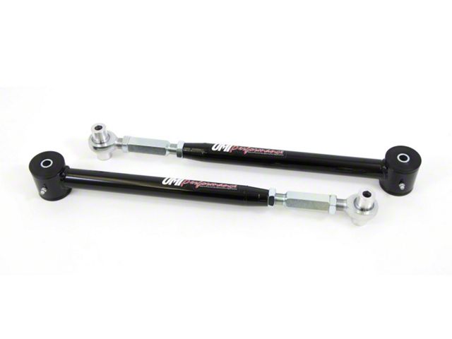 UMI's on-car adjustable lower control arms are supplied with a spherical rod end and polyurethane bushing combination. This set-up is designed for street performance and street enthusiast. The polyurethane bushing end is designed to be bolted to the vehicle chassis side while the rod end attaches to the rear end side. Since the polyurethane bushings are softer they are designed to absorb more road noise and shock before it enters the passenger compartment of the vehicle. The adjustment of the control arms allows them to be adjusted longer or shorter moving the rear end back or forward to squeeze those larger tires in the fender wells. Adjustable control arms are also recommended for most aftermarket rear end installs to center the rear end and prevent tire rubbing. These control arms feature on-car adjustability. Making adjustments is as simple as loosening two jam nuts and using UMI's chromoly on car adjuster. Simply turn the adjuster with the control arms attached to the vehicle to quickly lengthen or shorten the control arm to the desired length. Control arms are CNC machined and TIG welded for superior strength and perfect fitment.