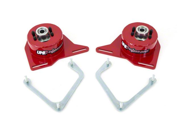 UMIs heavy duty caster and camber plates allow you to make alignment changes that are not permitted with the factory strut mounts. These heavy duty strut mounts are fully TIG welded using steel and feature a chromoly Teflon lined spherical bearing. The chromoly spherical bearing replaces the factory rubber strut mount bushing. The spherical bearing features a Teflon race which keeps the bearing lubricated and noise free. The UMI strut mounts feature additional adjustment on the mounting plate and the bearing housing allowing the user to make changes for the track and the street. Mounts are also built with increased height to provide additional travel for lowered vehicles.
