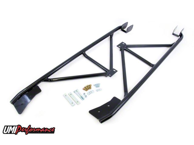 UMI offers the tightest fitting convertible 3-Point subframe connector on the market. The USA manufactured subframe connector by UMI is designed to tuck tight against the vehicle floor preventing ground clearance loss and exhaust clearance issues. Unlike our competitors design the UMI 3-Point subframe connectors are bent and contoured to follow the floor pan of the car. This time consuming process assures UMI offers a superb fitting system, with excellent clearance and fitment. No other subframe connector is built like this. Subframe connectors are designed to tie the front and rear subframes together while adding additional cross bracing throughout the center of the vehicle. Improving chassis stiffness reduces dash rattles, t-top squeaks and quarter panel flexing. The UMI 3-Point design works with all driving types and allows better weight transfer for improved traction and straighter launches. UMI's 3-Point set up is 100% bolt in and requires no cutting, drilling, welding or fuel line relocation. Kit includes detailed installation instructions, mounting brackets and high grade hardware. Although this set-up is a bolt in kit it can be welded at any time.