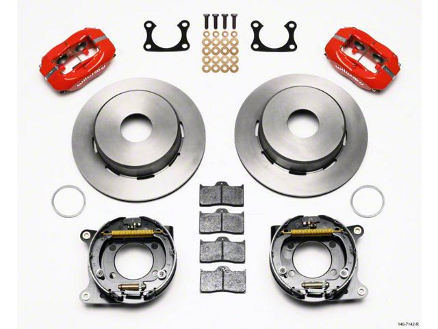 This group of FDL Pro-Series rear disc kits provides a complete solution for popular muscle car rear axles that require a parking brake. Forged billet Dynalite four piston calipers, 12.19" one-piece drum/rotors, and high friction pads provide optimized and balanced braking for all types of custom performance street/strip and show machines. The neatly hidden internal shoe system provides a clean installation with superior static holding power for parking. Optional caliper finishes and rotor designs enable the builder to personalize the style and optimize brake performance for every individual application.