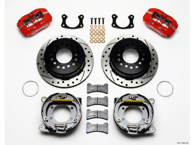 Forged Dynapro Low-Profile Pro-Series rear disc brake kits provide a complete solution for popular muscle car rear axles on applications that require a parking brake assembly and extra clearance for 14.00" to 15.00" rim applications. Forged billet Dynapro Low-Profile four-piston calipers 11.00" one-piece hat and rotor assemblies, and high friction pads provide optimized and balanced braking for all types of custom performance street/strip and show machines. The neatly hidden internal shoe system provides a clean installation with superior static holding power for parking. Optional caliper finishes and rotor designs enable the builder to personalize the style and optimize brake performance for every individual application.