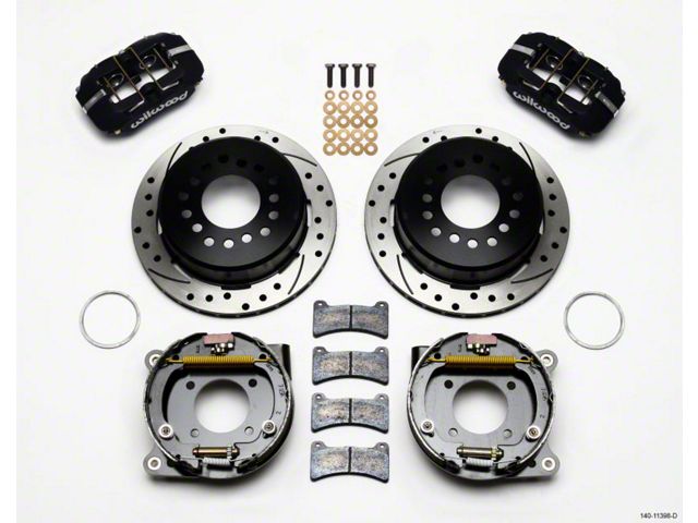 Forged Dynapro Low-Profile Pro-Series rear disc brake kits provide a complete solution for popular muscle car rear axles on applications that require a parking brake assembly and extra clearance for 14.00 to 15.00 rim applications. Forged billet Dynapro Low-Profile four-piston calipers 11.00 one-piece hat and rotor assemblies, and high friction pads provide optimized and balanced braking for all types of custom performance street/strip and show machines. The neatly hidden internal shoe system provides a clean installation with superior static holding power for parking. Optional caliper finishes and rotor designs enable the builder to personalize the style and optimize brake performance for every individual application.