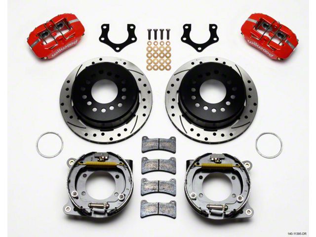 Forged Dynapro Low-Profile Pro-Series rear disc brake kits provide a complete solution for popular muscle car rear axles on applications that require a parking brake assembly and extra clearance for 14.00" to 15.00" rim applications. Forged billet Dynapro Low-Profile four-piston calipers 11.00" one-piece hat and rotor assemblies, and high friction pads provide optimized and balanced braking for all types of custom performance street/strip and show machines. The neatly hidden internal shoe system provides a clean installation with superior static holding power for parking. Optional caliper finishes and rotor designs enable the builder to personalize the style and optimize brake performance for every individual application.