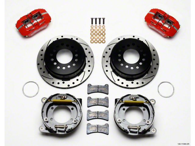 Forged Dynapro Low-Profile Pro-Series rear disc brake kits provide a complete solution for popular muscle car rear axles on applications that require a parking brake assembly and extra clearance for 14.00" to 15.00" rim applications. Forged billet Dynapro Low-Profile four-piston calipers 11.00" one-piece hat and rotor assemblies, and high friction pads provide optimized and balanced braking for all types of custom performance street/strip and show machines. The neatly hidden internal shoe system provides a clean installation with superior static holding power for parking. Optional caliper finishes and rotor designs enable the builder to personalize the style and optimize brake performance for every individual application.