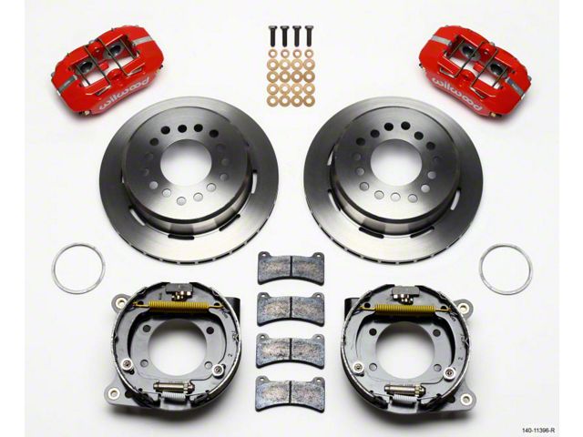 Forged Dynapro Low-Profile Pro-Series rear disc brake kits provide a complete solution for popular muscle car rear axles on applications that require a parking brake assembly and extra clearance for 14.00" to 15.00" rim applications. Forged billet Dynapro Low-Profile four-piston calipers 11.00" one-piece hat and rotor assemblies, and high friction pads provide optimized and balanced braking for all types of custom performance street/strip and show machines. The neatly hidden internal shoe system provides a clean installation with superior static holding power for parking. Optional caliper finishes and rotor designs enable the builder to personalize the style and optimize brake performance for every individual application.