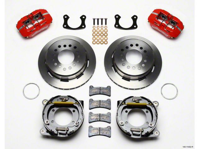 Forged Dynapro Low-Profile Pro-Series rear disc brake kits provide a complete solution for popular muscle car rear axles on applications that require a parking brake assembly and extra clearance for 14.00" to 15.00" rim applications. Forged billet Dynapro Low-Profile four-piston calipers 11.00" one-piece hat and rotor assemblies, and high friction pads provide optimized and balanced braking for all types of custom performance street/strip and show machines. The neatly hidden internal shoe system provides a clean installation with superior static holding power for parking. Optional caliper finishes and rotor designs enable the builder to personalize the style and optimize brake performance for every individual application.