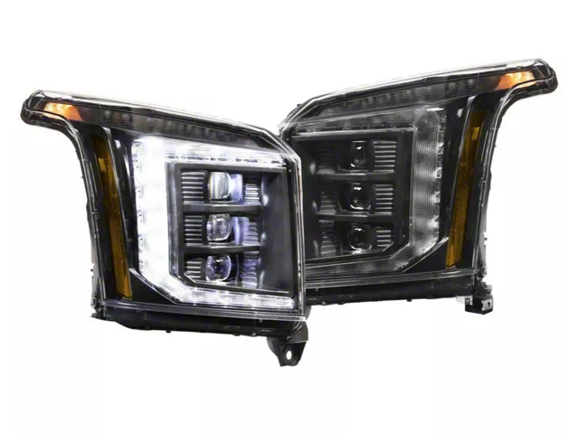 More Modern: The stock GMC Yukon headlights may have an LED daytime running light! but the single projector optics lack real performance when it comes to illuminating the road at night, and the standard turn signal is just plain boring. With the new Morimto XB LED Yukon headlights, you get all of the most modern features that make headlights so attractive today. Triple Bi-LED projectors, full LED daytime running light, and sequential LED turn signal. Whether your hauling family or friends or driving for Uber Black Trucks, Your truck needs better headlights, aka these headlights. DAYTIME RUNNING LIGHT: The design of the Morimoto XB LED heads for the Yukon is reminiscent of the Escalade headlights with the stacked LED projectors, which is fitting to the overall design of these trucks. The LED daytime running light is powered by Osram 5000K LEDs and is insanely bright, easily visible during the day! .that daytime running light will also dim down when the parking lights or low beams are on for compliance reasons. When the DRL activates, the projectors illuminate in a unique dual-intensity start-up sequence which looks killer! Just above that: The trademark sequential turn signal that we've grown to love on so many of the other models in the Morimoto lineup. If you're not a fan of the sequential effect, no problem. You can run the blinker in standard mode too. All wrapped upside a gloss black housing, these things would be a killer aesthetic upgrade for any truck! . But the real beauty here is that it's not ALLLLL about looks. These things are quite functional too. Triple Bi-LED: The Morimoto XB LED headlights for the 15-19 GMC Yukon come standard with three high-output LED projectors per headlight. Yes, that's a total of 6x low beams and 4x high beams to illuminate the road ahead. Thanks to their uniquely shaped projector lenses paired with modern optics within, they're going to perform even better than they look. The full LED low and high beam are an instant upgrade over stock, with a wider, brighter low beam, and a high beam that will penetrate far into the distance with ease. To top it all off, these optics meet & exceed all SAE, DOT standards when aimed properly, which is easy to do with their integrated aiming adjusters. PLUG-N-PLAY: As for wiring: Morimoto's LED headlights are designed to work on your Yukon without any modifications. No error codes! no flickering. No hyper-flashing! no nonsense. WELL-BUILT: Their UV-coated polycarbonate lens will resist the test of time, ensuring your truck's new headlights will look good as new for many years to come. The PPS plastic housing is light-weight and much stronger than comparable alternatives. The die-cast aluminum heat-sinks inside the housings provide more than an adequate amount of cooling for the OEM grade LED chips that produce the light.
