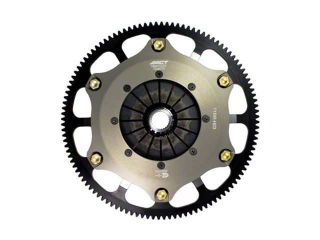 T1RR-H03 race, twin disc kits are race-ready for the serious enthusiast who needs a direct bolt-in kit, requiring no additional modifications. ACT's sintered iron race discs offer the highest torque capacity of all ACT race discs and have ultra-high heat capacity. Most kits offer pedal loads 10-20% higher than stock, yet increasing the clamp load by 80-90%. All ACT twin disc kits include a CNC-machined and dynamically balanced flywheel for trouble free use. All kits undergo an exclusive four-stage, heat-treating process on all diaphragms. ACT twin disc kits include a pressure plate, two discs, floater, flywheel and alignment tool. Some kits may include a pilot bearing and release bearing. ACT Twin disc kits meet SFI Specification 1.2.