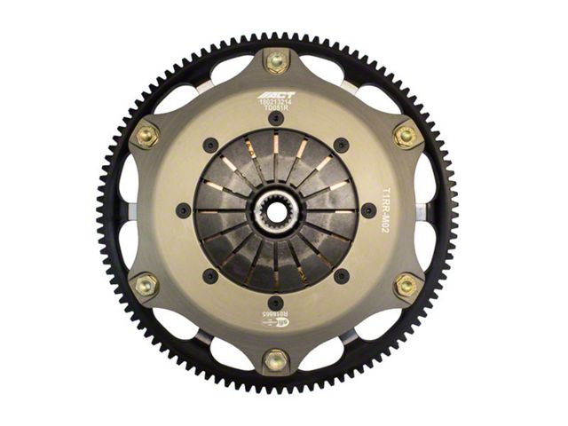 T1RR-M02 race, twin disc kits are race-ready for the serious enthusiast who needs a direct bolt-in kit, requiring no additional modifications. ACT's sintered iron race discs offer the highest torque capacity of all ACT race discs and have ultra-high heat capacity. Most kits offer pedal loads 10-20% higher than stock, yet increasing the clamp load by 80-90%. All ACT twin disc kits include a CNC-machined and dynamically balanced flywheel for trouble free use. All kits undergo an exclusive four-stage, heat-treating process on all diaphragms. ACT twin disc kits include a pressure plate, two discs, floater, flywheel and alignment tool. Some kits may include a pilot bearing and release bearing. ACT Twin disc kits meet SFI Specification 1.2.