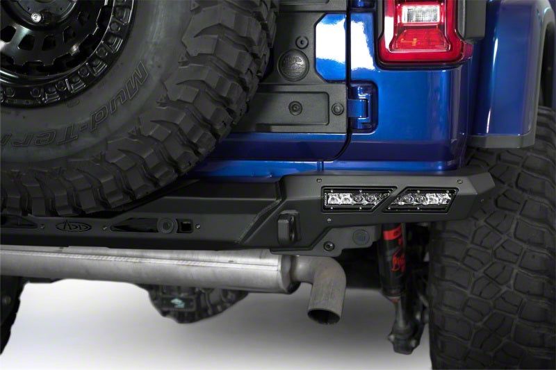 Our Phantom Series Rear Bumper features a low-profile knife's edge design for a sleek and trim fit that compliments your rig's factory styling. For supplemental lighting off-road, a 10-inch single row LED light bar can be mounted in the light pockets on each side. The integrated 1 in. thick clevis mounts that take ¾-inch D-rings provide recovery options so you are prepared for tough situations off-road. The center of the bumper is pocketed to provide room for the spare tire. OEM features such as the parking sensors and the trailer wiring harness are fully retained in the design. The Phantom is finished in a 2-stage hammer black powder coat with satin black aluminum accent panels, and features a fully bolt-on installation. This was proudly designed and manufactured in the USA.