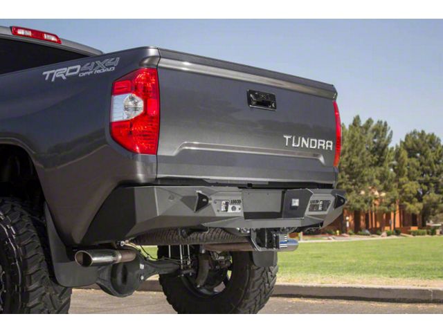 Addictive Desert Designs Stealth Fighter rear bumper for the Toyota Tundra is a slim steel plate design that adds protection without adding size or bulk to your truck. Two rear facing cube light mounts come standard with the Stealth Fighter and integrated reinforced clevis mounts accept a 3/4 in. D-Ring for added utility. Optional backup sensor cuts retain the Tundra's OEM features.