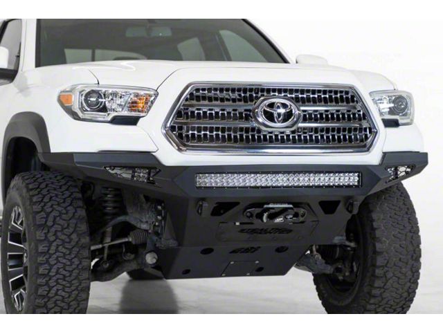 Addictive Desert Designs Stealth Fighter front bumper for the Toyota Tacoma is one of our best fitting and most aggressive looking bumpers on the market. A modern radius plate design allows the Stealth Fighter to keep a tight fit around the front of the Tacoma to match the factory design, while providing added protection. With our patented universal light mount system a 30 in. radius LED bar or up to 6 cube lights can be mounted into the center of the bumper. Additional lighting is available with two cube light mounts behind the side panels. Reinforced clevis mounts allow the use of a 3/4 in. D-Ring for added utility.