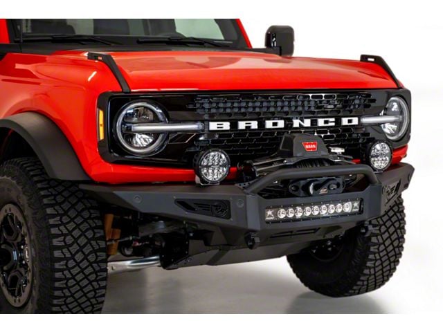 Transform the front of your Jeep with the Addictive Desert Designs Rock Fighter front bumper. The Rock Fighter is a stubby width bumper, meaning it will look good with any aftermarket fender you want to put on your JL. The patented universal light mount system in the center of the bumper allows you to mount any brand/size of light up to a 20 in. RDS or 5 cube lights. There are two additional cube light mounts on each top corner of the bumper. The two clevis mounts on the front of the bumper accept a 3/4 in. D-Ring and are reinforced to help out in tough situations. The Rock Fighter provides a greater approach angle to maximize offroad performance and two different top hoop options for even more front-end protection. This bumper is available with a low profile top hoop or a stinger. The main bumper structure comes in hammer black powder coat with satin black panels. This product is fully bolt-on and made in America.