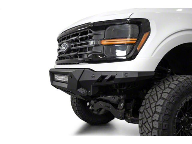 Our Black Label Ford F-150 Front Bumper enhances your truck's exterior styling with its aggressive design while providing lighting provisions for improving visibility. The slim wings and dual-stage hammer black powder coat finish contribute to the bumper's overall sleek look. For supplemental lighting, you can mount one 20-inch LED light bar in the integrated center mount. The Black Label Front Bumper tightly follows your truck's factory bodylines for a trim fitment, and with its satin black powder coated accent panels and detailed cutouts, it takes quality and attention to detail to the next level. Constructed from American steel, our bumper is built to protect your Ford from daily hazards. The bumper features mounting points for the OEM parking sensors to retain their full functionality, and it is fully bolt-on for a straightforward install process. The adaptive cruise control is retained with our F-150 ACC Relocation Bracket. As always, our bumpers are made in the USA.