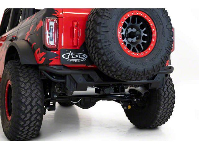 The ADD PRO Bolt-on Rear Bumper for the 2021-2023 Ford Bronco was designed with the tightest tolerances in order to flow perfectly with the contours of the body. Several .120-inch steel tubes with ¾-inch steel plating form the structure of the bumper, and are finished in our Hammer Black powder coat. The top plates and rear facing accent plate are constructed from 1/8-inch aluminum alloy and finished in a Satin Black powder coat. Included with the bumper is a License Relocation Bracket, which moves the plate above and towards the side of the bumper away from the spare tire. The OEM license plate light is integrated into this new location. An included 3rd Brake Light Extension Bracket enables you to mount up to a 37-inch spare tire on the factory carrier. The PRO Bolt-On is compatible with the factory hitch & trailer harness, and retains full functionality of the OEM reverse sensors. As always, this Bronco bumper is fully bolt-on and Made in America.