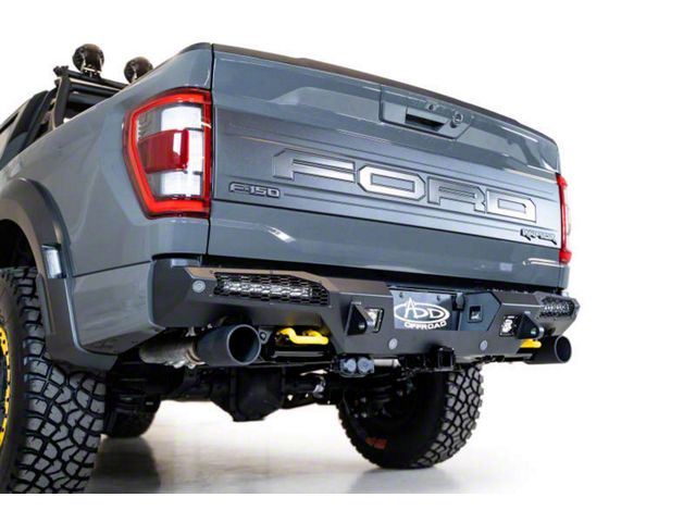 Made with plate steel and constructed in a modern box design, the HoneyBadger Raptor Rear Bumper provides superior protection. It's designed to flow with the Raptor's body lines tightly. Its factory dual exhaust and tow hooks fit comfortably below the bumper. Sensor cutouts retain full functionality of its parking/backup warning system. There are two, 1- in. clevis mounts that take 3/4- in. D-ring shackles to provide recovery options.Towards each end of the bumper are 10- in. LED light bar mounts behind satin black aluminum panels. Additionally, there are 2 pod light mounts on either side of the center of the bumper. A factory or aftermarket trailer wiring harness can be mounted to the bottom of the bumper near the hitch.