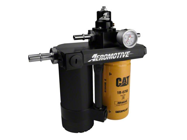 The Aeromotive diesel lift pump was developed to solve some key issues in the diesel lift pump market, most notably the tank issue, the pressure control issue, and motor shaft seal failures. Aeromotive opted for a flow-thru design to solve the shaft seal failure, which means there is no shaft seal to fail or leak. Specific to the Duramax platform is a fail safe valve. In the event of failure or a no-run condition, the valve will open and allow fuel to bypass the pump. This allows the vehicle to continue to run and get you to your destination, eliminating tow bills. With a brushless motor design, Aeromotive has increased the performance and longevity you would expect from a diesel lift pump. A single filter model simplifies the design and reduces maintenance cost. Our diesel pump includes the Caterpillar 1R-0750 2-micron filter to catch the smallest particulates. With a standard 1-14 filter head thread, the end user can use their filter of choice.