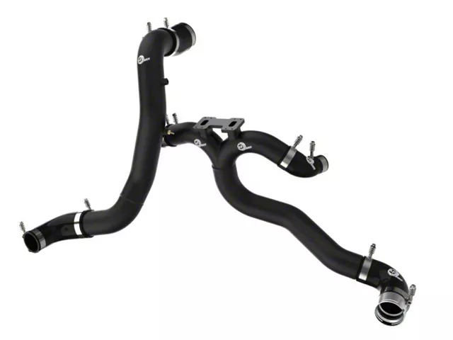 Smooth transitions in the mandrel-bent aluminum pipes decrease turbulence and minimize pressure loss, increasing horsepower and torque. The charge pipe kit provides a smooth transition between the turbo and the engine for lower operating temperatures and increased power. This kit includes high-quality, stainless-steel, spring-loaded T-bolt clamps and heavy-duty, 5-ply, polyester reinforced silicone couplings. This charge pipe kit features factory style billet aluminum quick-connect adapter with an o-ring to ensure a leak-free fit while maintaining superior strength and durability. Finished in wrinkle black powder coating with a unique laser-etched aFe power logo for a custom look.
