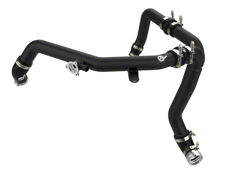Smooth transitions in the mandrel-bent aluminum pipe decrease turbulence and minimize pressure loss, increasing horsepower and torque. This kit includes high-quality, stainless-steel, spring-loaded T-bolt clamps and heavy-duty, 5-ply, polyester reinforced silicone couplings. This charge pipe kit features factory style billet aluminum quick-connect adapter with an O-ring to ensure a leak-free fit while maintaining superior strength and durability. Finished in wrinkle black powder coating with a unique laser-etched aFe power logo for a custom look.