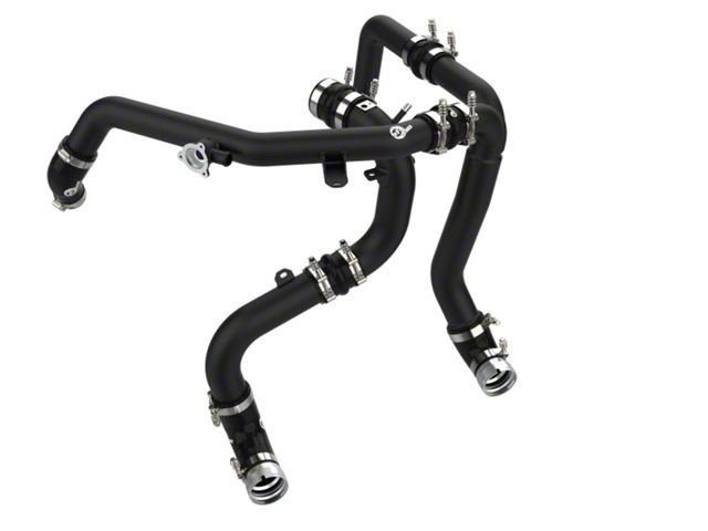 Smooth transitions in the mandrel-bent aluminum pipes decrease turbulence and minimize pressure loss, increasing horsepower and torque. This charge pipe kit provides a smooth transition between the turbo and the engine for lower operating temperatures and increased power. This kit includes high-quality, stainless-steel, spring-loaded T-bolt clamps and heavy-duty, 5-ply, polyester reinforced silicone couplings. This charge pipe kit also features factory style billet aluminum quick-connect adapters with O-rings to ensure a leak-free fit while maintaining superior strength and durability. Finished in wrinkle black powder coating with a unique laser-etched aFe power logo for a custom look.