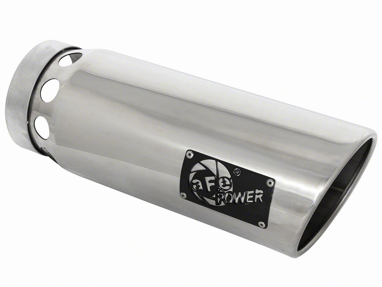 aFe Power is proud to introduce an all new intercooled exhaust tip. This tip comes with a polished finish and is designed to fit 5 exhaust systems. With a 5 inlet x 6 outlet and 16 inch length, this single-walled, angle cut rolled tip comes with intercooling vents and a unique laser-cut aFe Power logo plate riveted on for an aggressive style.