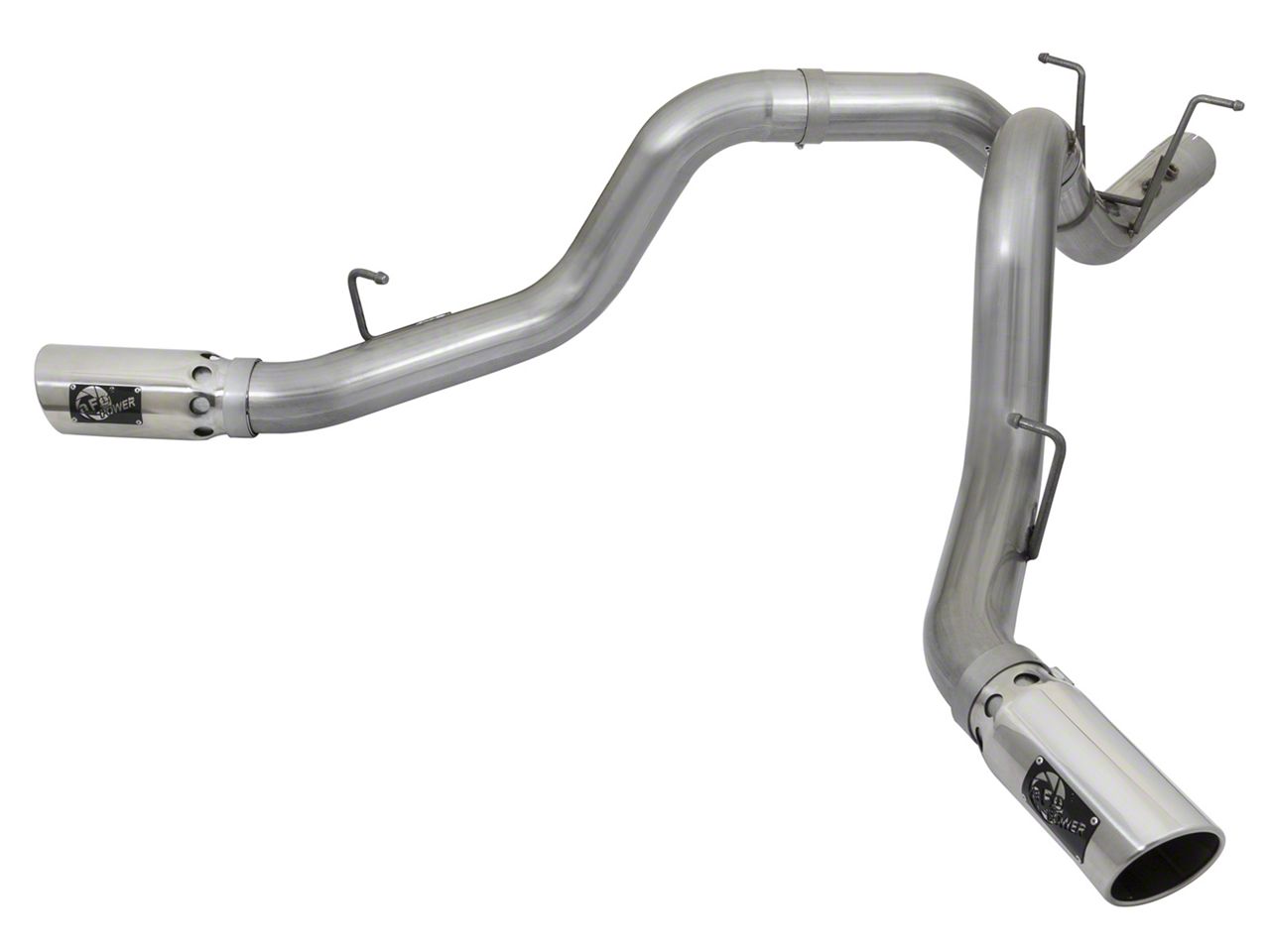 Interested in a new exhaust system for your L5P Duramax? Check out the Large Bore-HD dual DPF-Back exhaust system by aFe. This system is constructed from 4" mandrel-bent 409 stainless steel tubing and uses high quality band clamps and OE-style bayonet hangers. This unit uses all factory mounting locations and comes with a bolt-on bracket that supports the driver side tailpipe. This provides for a quick, hassle-free installation with no modification necessary. Also included in this exhaust system are dual massive 6" high temp black powder-coated stainless steel tips with a laser-cut stainless steel aFe power badges. Large Bore-HD exhaust systems are the perfect combination of performance, fit and value. Single To Dual Exhaust Conversion: This exhaust is designed to convert the standard single exhaust into an aggressive dual exhaust. Fits With Spare Tire: This exhaust system fits perfectly without relocating the spare tire. OE Fit: OE-style bayonet hangers are used to maintain a stable pipe location during high vibration and high heat conditions. The bayonet tip holds the hanger bushing in place for an OE-style fit that does not change with time. Flow and Performance: This Large Bore-HD exhaust system is constructed from 4" mandrel-bent stainless steel tubing for maximum flow. Smooth transition bends allow for low turbulence, increasing horsepower, torque and lowering EGT's. Polished Tips: Finishing off the exhaust are dual high luster, polished 304 stainless steel slash-cut tips. This tip features a laser-cut stainless steel aFe power badge for an aggressive style