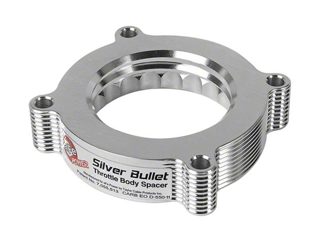 Silver Bullet throttle body spacers create turbulence in the air flow at the point just prior entry into the engine increasing horsepower, torque and improving throttle response and fuel efficiency. Silver Bullet throttle body spacers are constructed out of durable T-6061 billet aluminum and using a unique serrated/helix entry to create turbulence at the manifold while eliminating the annoying whistle found in other helix only throttle spacers.