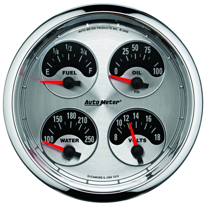 Sometimes space is limited. The AutoMeter Quad Gauge provides a solution to limited dashboard space while providing a clean look. Individual AutoMeter air core meter movements for each function provide the accuracy and durability required by even the most demanding applications. Includes a single wire 1/8 NPT temperature sender and a 1/8 NPT oil pressure sender. The voltmeter reads from 8-18v on negative ground electrical systems and fuel level resistance range is 0 ohms empty to 90 ohms full (compatible with Amid 60s through mid 90s GM fuel level senders).Having a set of gauges in your car can be very critical, especially if you're one who likes to drive aggressively at the track. Keep an eye on the health of your vehicle with Air fuel ratio (afr), oil pressure, oil temperature, water temperature, and many more gauges. Select from our list of brands like AEM, Turbosmart, Innovate, Autometer, and more!Gauges are an important feature in every project car. By having a proper set of gauges installed in your car, you will be able to read all the vital signs of your engine.Since 1957 AutoMeter has been driven to provide performance enthusiasts with the information they need to win. We've revolutionized the way that racers and vehicle builders think about instrumentation and vehicle electronics for more than 60 years. AutoMeter was founded by Vern Westberg in 1957. In the early days, Vern would pour sand castings in his family's backyard, and his sons would help him assemble products in their basement at night.During our 60+ years, we have developed many industry-leading products from our rev control tachometers and quick responding tachometers, to our high technology LCD Competition data acquisition systems. We have set the standard for accuracy, precision, and durability. Today, we have state-of-the-art cellular manufacturing centers, advanced engineering systems, and product technology that is unmatched in the instrumentation marketplace.Company Overview AutoMeter Products, Inc. is a high technology company based in Sycamore, IL USA, with a state-of-the-art cellular manufacturing operation, world class ISO 9000:TS 16949 Certified Quality System, an advanced engineering team, and product technology that is unmatched in the instrumentation marketplace. In addition to the more commonly known AutoMeter High Performance division focused on performance and racing automotive instrumentation and electronics, AutoMeter also includes four additional branches that cater to specialty markets:AutoMeter Original Equipment Division that works with large clients for the creation of specialty instrumentation for production vehicles. AutoMeter Pro-Cycle Division that designs and produces product geared specifically for the motorcycle industry. AutoMeter Marine Division, which produces instrumentation for water-borne vehicles. AutoMeter Test Equipment Division that produces professional grade automotive battery and electrical chargers and testers for automotive repair and vehicle fleet maintenance.In 2007, AutoMeter expanded its performance family to include two new companies with the acquisition of Stack, Ltd. of England, whose roots are in Formula 1 instrumentation and are famous for their dash displays and data acquisition systems, and Dedenbear Products, a company renowned for throttle stops, delay boxes, and drag racing electronics. AutoMeter is excited about the opportunities presented in these partnerships and are bringing to market several new and exciting designs and technologies including the Ultra-Lite Pro Data Acquisition System, the Dedenbear STS Throttle Stop, and Stack Pro-Control Professional Stepper Motor Gauges.In 2012, AutoMeter expanded once again with the acquisition of ProParts LLC. Born on the high speed ovals of NASCAR and refined on road courses and drag strips around the world, Spek-Pro gauges are some of the most advanced instruments ever conceived. AutoMeter welcomes the ProParts Spek gauges into our ever growing motorsports product line to offer the absolute best features no matter the application.