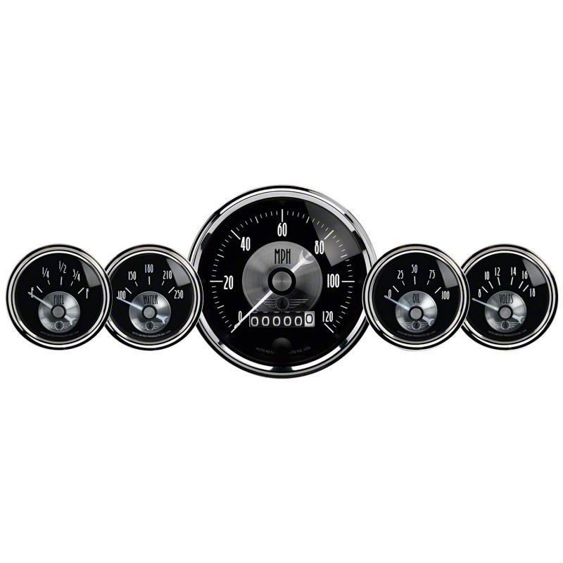 AutoMeter has brought together the most popular gauges into a simple kit. The kit includes a speedometer, water temperature, oil pressure, fuel level, and voltmeter. All senders included where applicable.Having a set of gauges in your car can be very critical, especially if you're one who likes to drive aggressively at the track. Keep an eye on the health of your vehicle with Air fuel ratio (afr), oil pressure, oil temperature, water temperature, and many more gauges. Select from our list of brands like AEM, Turbosmart, Innovate, Autometer, and more!Gauges are an important feature in every project car. By having a proper set of gauges installed in your car, you will be able to read all the vital signs of your engine.Since 1957AutoMeter has been driven to provide performance enthusiasts with the information they need to win. We've revolutionized the way that racers and vehicle builders think about instrumentation and vehicle electronics for more than 60 years. AutoMeter was founded by Vern Westberg in 1957. In the early days, Vern would pour sand castings in his family's backyard, and his sons would help him assemble products in their basement at night.During our 60+ years, we have developed many industry-leading products from our rev control tachometers and quick responding tachometers, to our high technology LCD Competition data acquisition systems. We have set the standard for accuracy, precision, and durability. Today, we have state-of-the-art cellular manufacturing centers, advanced engineering systems, and product technology that is unmatched in the instrumentation marketplace.Company OverviewAutoMeter Products, Inc. is a high technology company based in Sycamore, IL USA, with a state-of-the-art cellular manufacturing operation, world class ISO 9000:TS 16949 Certified Quality System, an advanced engineering team, and product technology that is unmatched in the instrumentation marketplace. In addition to the more commonly known AutoMeter High Performance division focused on performance and racing automotive instrumentation and electronics, AutoMeter also includes four additional branches that cater to specialty markets:AutoMeter Original Equipment Division that works with large clients for the creation of specialty instrumentation for production vehicles.AutoMeter Pro-Cycle Division that designs and produces product geared specifically for the motorcycle industry.AutoMeter Marine Division, which produces instrumentation for water-borne vehicles.AutoMeter Test Equipment Division that produces professional grade automotive battery and electrical chargers and testers for automotive repair and vehicle fleet maintenance.In 2007, AutoMeter expanded its performance family to include two new companies with the acquisition of Stack, Ltd. of England, whose roots are in Formula 1 instrumentation and are famous for their dash displays and data acquisition systems, and Dedenbear Products, a company renowned for throttle stops, delay boxes, and drag racing electronics. AutoMeter is excited about the opportunities presented in these partnerships and are bringing to market several new and exciting designs and technologies including the Ultra-Lite Pro Data Acquisition System, the Dedenbear STS Throttle Stop, and Stack Pro-Control Professional Stepper Motor Gauges.In 2012, AutoMeter expanded once again with the acquisition of ProParts LLC. Born on the high speed ovals of NASCAR and refined on road courses and drag strips around the world, Spek-Pro gauges are some of the most advanced instruments ever conceived. AutoMeter welcomes the ProParts Spek gauges into our ever growing motorsports product line to offer the absolute best features no matter the application.