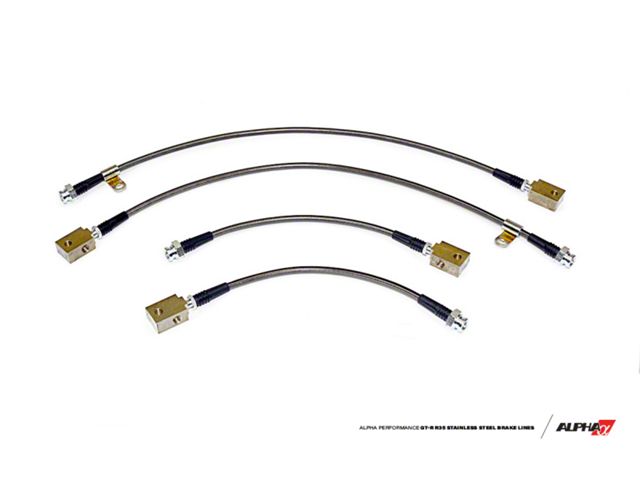 The Alpha R35 GTR Race Style SS Brake Lines - stainless steel braid to improve pedal feel and reduce the amount of time between applied pedal pressure and actual deceleration by reducing the expansion that is allowed by stock rubber flex lines.