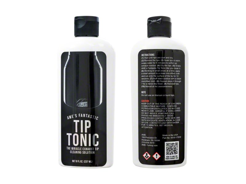 Formulated to cut through the grime and give your tips a perfect finish, AWE's Fantastic Tip Tonic cleans without the use of harsh abrasives, acids, or ammonia. Developed and tested over multiple Mid-Atlantic winters, Tip Tonic has been developed to perform in rough conditions, and shine in any climate. Tip Tonic is recommended for use on both Chrome Silver and Diamond Black AWE exhaust tips, and encouraged to be used frequently (or when you would wash your car) to keep the shine at the front of the line. Please note: AWE's Fantastic Tip Tonic is not safe to use on titanium or burnt tips.