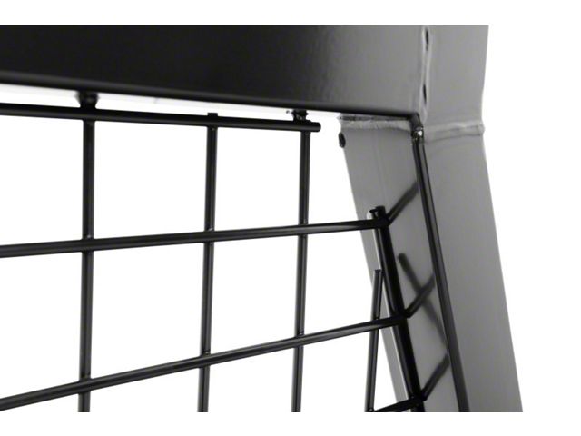 Has welded wire mesh to provide full window protection. Has wider carrying capacity above cab. Each intersection of wire is welded to avoid rattling and provide strength. Less flexibility to mount accessory light brackets than the BACKRACK. Is more expensive than the BACKRACK. Sits higher above the cab than the BACKRACK.