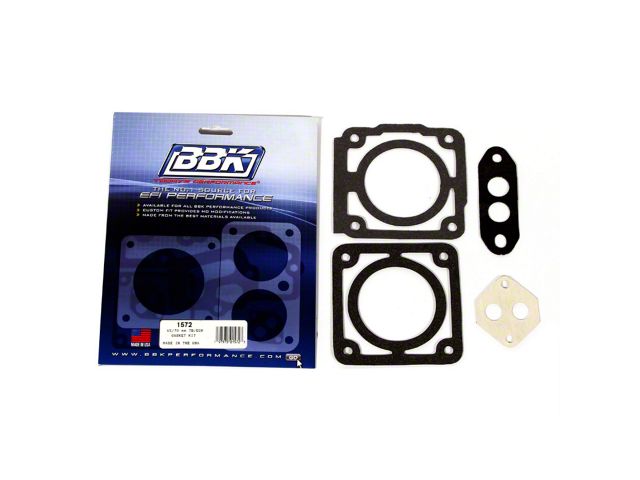 Throttle body gaskets can deteriorate and dry out over time and cause air or coolant leaks causing drive ability issues. They should be replaced every time the throttle body has undergone any replacement, repair or service. All throttle body gaskets should be changed when you suspect or there is evidence of a leak. BBK Performance throttle body gaskets are made from high quality gasket materials to last and for the most part are a relatively simple installationThese Premium Quality Gasket Sets are the same ones included with all of our Power plus series throttle bodies and can be used for most stock and aftermarket installations. Available for most popular late model EFI applications including Mustang, Camaro, Firebird, Corvette, Ford F Series and GM truck as well as many Jeep and Import applications.