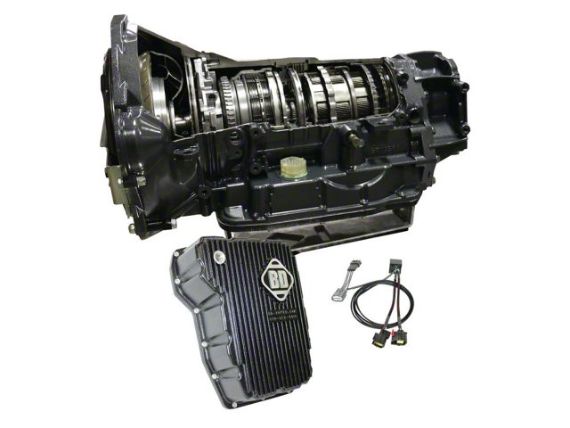 Hard anodized valve body and new solenoid pack installed in every unit; Custom valve body separator plate with gaskets increases line pressure while stopping internal cross leaks; Heavy duty cam & roller design low reverse one way clutch; New 4C billet spring retainer; Steel girdle added to 2C piston to allow for more clutches and broader apply area; BD durable QT100 pressure plates allow for increased clutch counts and reduce deflection and distortion within the clutch drum; Clutch count increased to hold high torque level - Over Drive 17% increase, Under Drive 20%, 2C 33% increase; BD reinforced accumulator plate; TCC limit valve machined and sleeved to address high wear area with in pump; BD Deep sump oil pan adds extra fluid and cooling capacity while reducing case flex; BD ProTech68 pressure control module ramps up line pressure to 250 psi using MAP sensor to input load and adjust pressure required