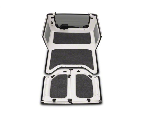 This 100% waterproof, fully custom die cut headliner kit installs quickly without the need to remove your hard top. The individual pieces can be quickly installed by removing the specially designed tape and pressing firmly into place. The BedRug material resists all harsh chemicals, and will not stain, stink, mold or mildew. The 1/2-inch polypropylene foam will help insulates your interior from road noise and heat.