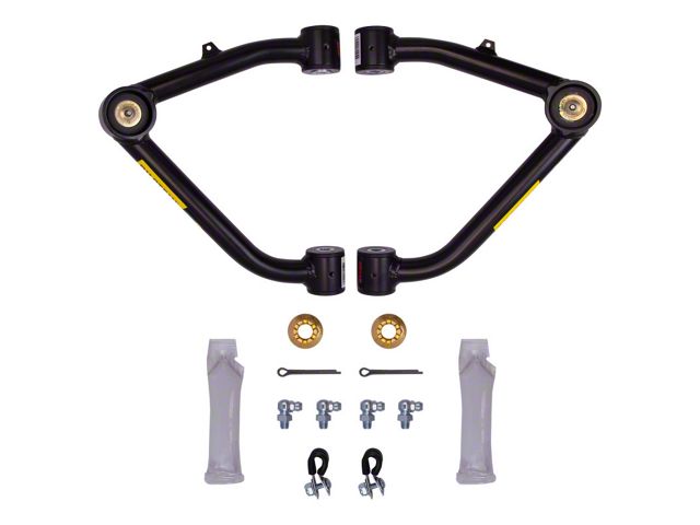 B8 Control Arms are a direct fit upgrade for factory upper control arms on trucks and SUVs. The kit contains a pair of control arms which correct the caster alignment for better straight line stability with lifted suspensions, and the improved pivot angles increase wheel travel and reduce stress on the joints. These strong black powder-coated 4130 chromoly steel arms are a tubular design which allows for more spring and shock clearance and feature greasable polyurethane bushings and heavy duty ball joints for the ideal combination of ride quality and durability with minimal maintenance needed. They come with detailed instructions and all necessary hardware for easy installation and are compatible with all Bilstein shocks and coilover kits. All components are replaceable.