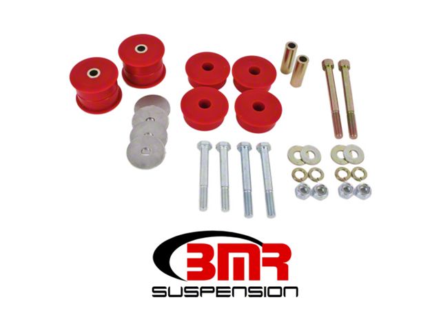 Minimize wheelhop and enhance the rear stability of your S550 or S650 Mustang by decreasing differential movement with polyurethane differential bushings from BMR Suspension. Polyurethane is a synthetic polymer with many properties that make it far superior to OEM rubber for bushings. Polyurethane deflects far less that soft rubber, and it doesn't breakdown from exposure to petroleum products, road salt, ozone, and other elements of the harsh undercar environment suspension bushings live in. BMR Suspension's polyurethane Differential Bushings (BK049) drastically decreases differential movement and pinion rise over the factory rubber bushings. BMR designed its polyurethane differential bushings from 95-durometer polyurethane. This material offers huge reductions in deflection without excessive increases in NVH. Each bushing is manufactured to strict tolerances, using exact molds, which are designed by BMR. This allows for a perfect fit and increased performance for any driving style. If you have stock power or huge power, and plan on launching your car hard, BMR includes heavy-duty hardware for the Polyurethane Differential Bushing Kit. A small percentage of customers have experienced differential mounting bolt failures with various differential-mounting solutions, including OEM bushings. This primarily occurs with higher than stock power levels, or with hard launches on the street or track. BMR's heavy-duty hardware helps combat these failures. This hardware is not necessary for all customers, but BMR supplies the upgrade for those who have higher than factory power levels or plan on launching their S550 or S650 hard on the street or at the dragstrip. This hardware upgrade requires slight modification to the rear differential mounts. BMR Suspension's BK049 Differential Busing Kit is available in red with zinc-coated hardware. Installation time is about 3-4 hours and may vary depending on stock bushing removal technique. Proudly made in the U.S.A.!