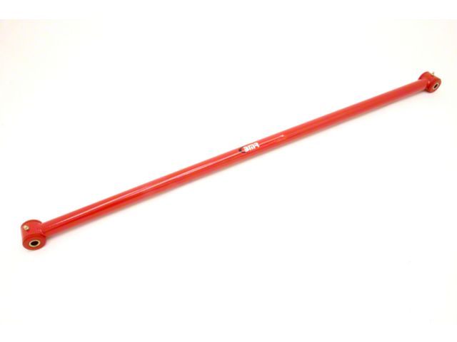 A Panhard rod is a suspension link that both locates the rear axle housing laterally and controls side-to-side movement. Factory S197 Mustang Panhard rods are made from weak U-shaped stamped steel with soft rubber bushings that allow excessive deflection under load. BMR Suspension's PHR005 Panhard rod is made 1.25-inch, 0.120-inch wall DOM tubing for unrivaled strength. The PHR005 features greasable, 95-durometer bushings, which add a solid, more responsive feel over the stock rubber bushings. BMR's bushings are internally fluted, which allows grease to evenly coat the inner sleeve, keeping grease in the bushing under high compression loads. These flutes also direct grease to the outer edge of the bushing, keeping the thrust surface lubricated. This efficient lubrication ensures quiet, reliable operation over the life of the bushings. BMR Suspension designed the PHR005 to work well for street performance, drag race, and road race applications. The heavy-duty construction eliminates the deflection seen in stamped-steel Panhard rods. Other Panhard rods on the market include rubber bushings that will deflect under heavy loads. The 95-durometer polyurethane bushings of the PHR005 reduce bushing deflection, giving you much-improved, repeatable handling characteristics on the street, starting line, or in aggressive corners. The non-adjustable design makes the PHR005 great for stock height Mustangs. This gives you all the strength you need for great handling without huge increases in NVH. When performance is a must, rely on BMR Suspension! BMR Suspension's PHR005 non-adjustable Panhard rod is available in black hammertone and red powdercoat for long-lasting good looks. Installation time is about 1 hour. Proudly made in the U.S.A.