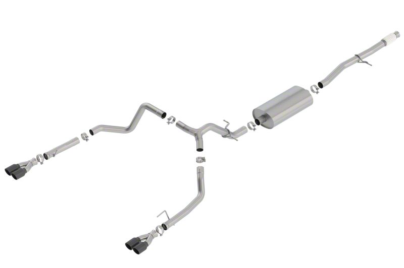 Factory Split Rear Exit vehicles ONLY. Add Adapter 60708 for Crew Cab with Standard Bed (6' 7") 157" Wheelbase vehicles. This system features the mellow Touring sound level and 3.5" black chrome on T-304 stainless steel tips. Bright chrome on T-304 stainless steel tips and carbon fiber tips are also available. Installation REQUIRES removal of the Factory Valance Tips. Using BORLA(r) Stainless Steel Polish p# 21461 is NOT recommended with these black chrome tips. We suggest cleaning the tips with hot water and a microfiber cloth. Carbon fiber tips with bright centers are also available. BORLA(r) Cat-Back(tm) and Axle-Back exhaust systems feature patented straight-through and multi-core technology designed to unleash hidden horsepower. Increased exhaust velocity adds power, driving excitement, fuel economy, and the distinctive BORLA(r) Sound of Power respected by motoring enthusiasts everywhere. Each system is built from premium T-304 stainless steel, superior to T-400 series knockoffs (such as 409), to give you the absolute best in performance and durability. Ultra-smooth mandrel bends ensure maximum flow & power, and precision computer numerical control (CNC) manufacturing ensures an accurate fit. Best of all, BORLA(r) stands behind every system with a Million-Mile Warranty. Just what you'd expect from the world's most experienced (and most winning) exhaust brand.