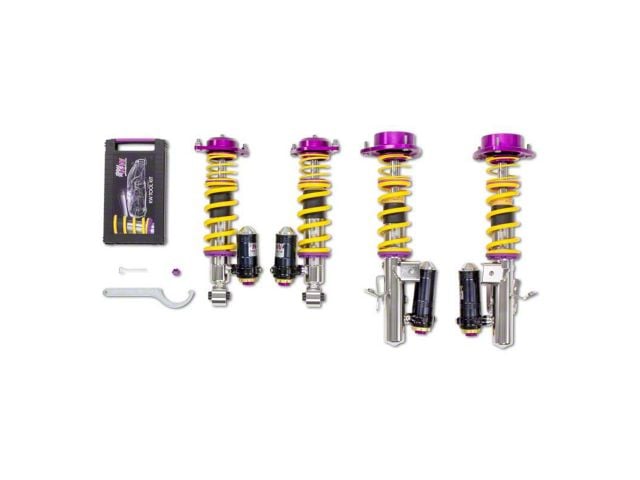 Using the Nordschleife as its testing grounds and the 7-post rig, KW developed its V4 Clubsport coilover kit. Wheel loads, vehicle weight and chassis reinforcements (increased body stiffness) can all be taken into consideration with Adjustment capabilities of the V4 Clubsport. The KW Clubsport coilovers combine KW's high-end racing technology with maintenance-free KW OEM quality components. Designed to provide you the ideal product to utilize the full potential of your sports car during autocross, track days, high performance drivers education (HPDE) courses, club racing, and is tested rigorously on race tracks such as the Nurburgring Nordschleife. Race teams rely on KW's racing expertise and experience for their vehicle setup. This same championship winning pedigree is mirrored in the development of each one of the KW Clubsport coilover systems. Similar to the KW Competition suspension used in international motorsports, the KW V4 Clubsport coilover kit allows fine tuning of the compression damping separately in the low-speed and high-speed range. The click adjustments of the TVCLH-A valve technology make for easy Adjustment directly on the reservoir. You can modify the low-speed compression damping with 6 precise clicks with the purple low speed Adjustment dial and directly beneath it the golden Adjustment wheel provides an additional 14 precise clicks of high speed compression adjustment. In addition, the TVR-A technology provides 16 clicks to noticeably adjust the rebound damping independently of the compression damping. If you would like to adjust the KW V4 Clubsport coilover kit it can easily be adjusted for more comfort or to an alternative setup for a new race track. The KW V4 Clubsport benefits from the same motorsports technology that has proven its endurance with multiple overall wins at the ADAC Zurich 24h Nurburgring race.